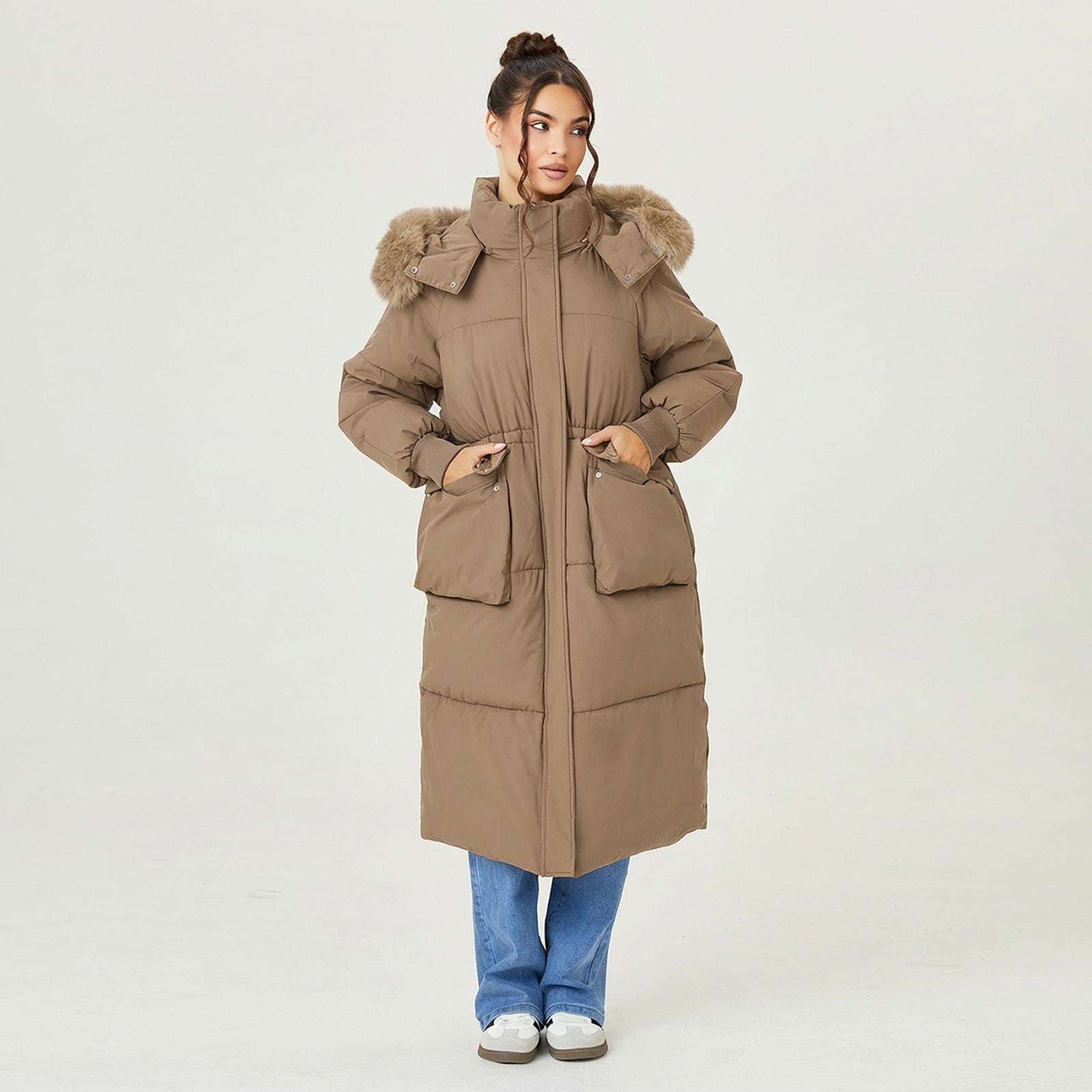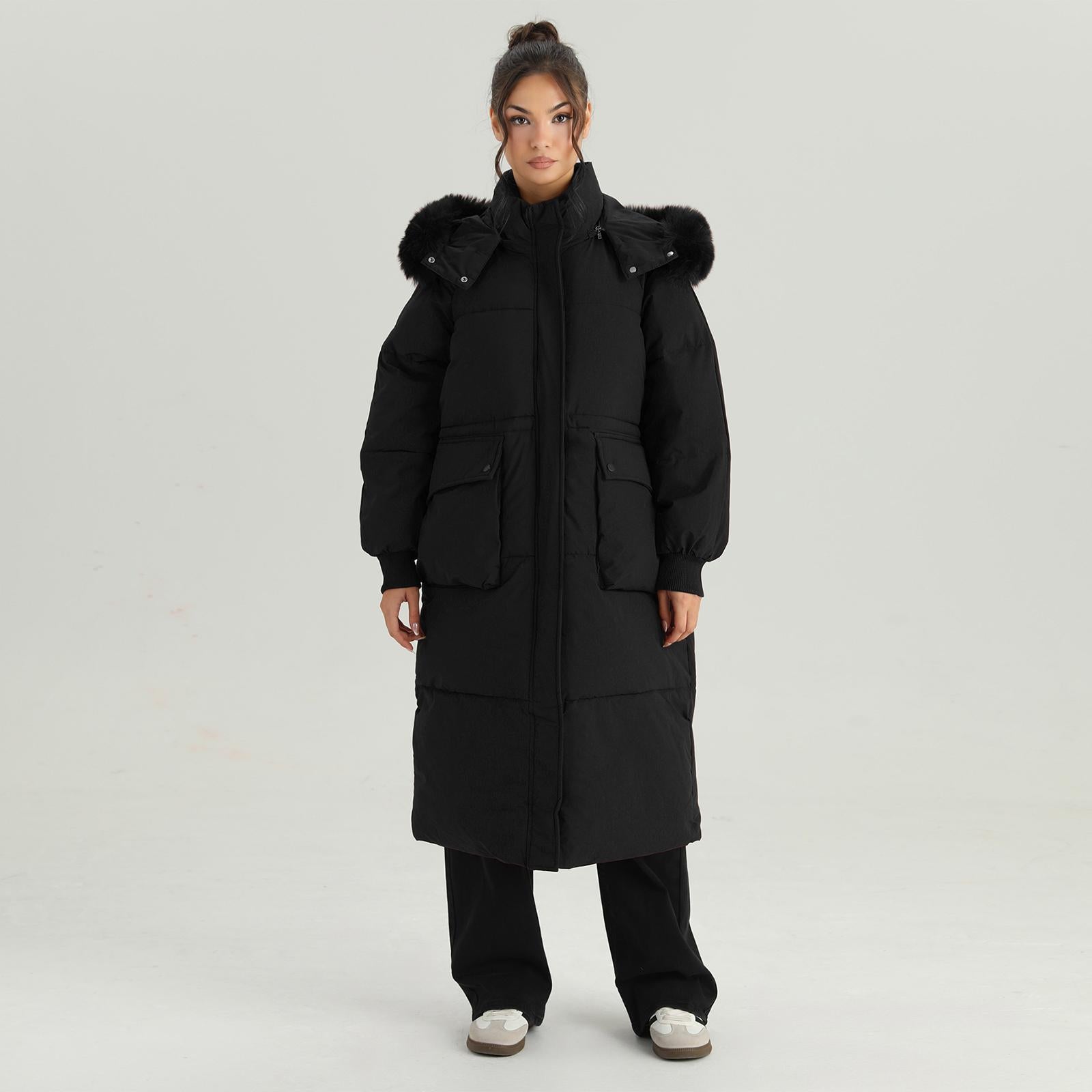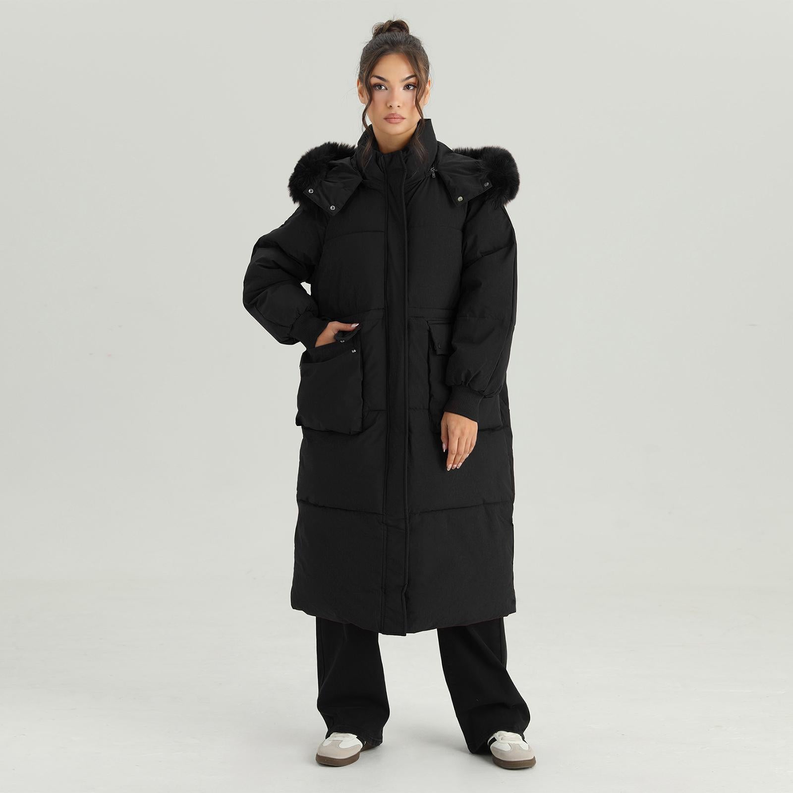 Details: Long sleeves, Attached fluffy hood, Flap pockets, Mid-length, Thermal fabric