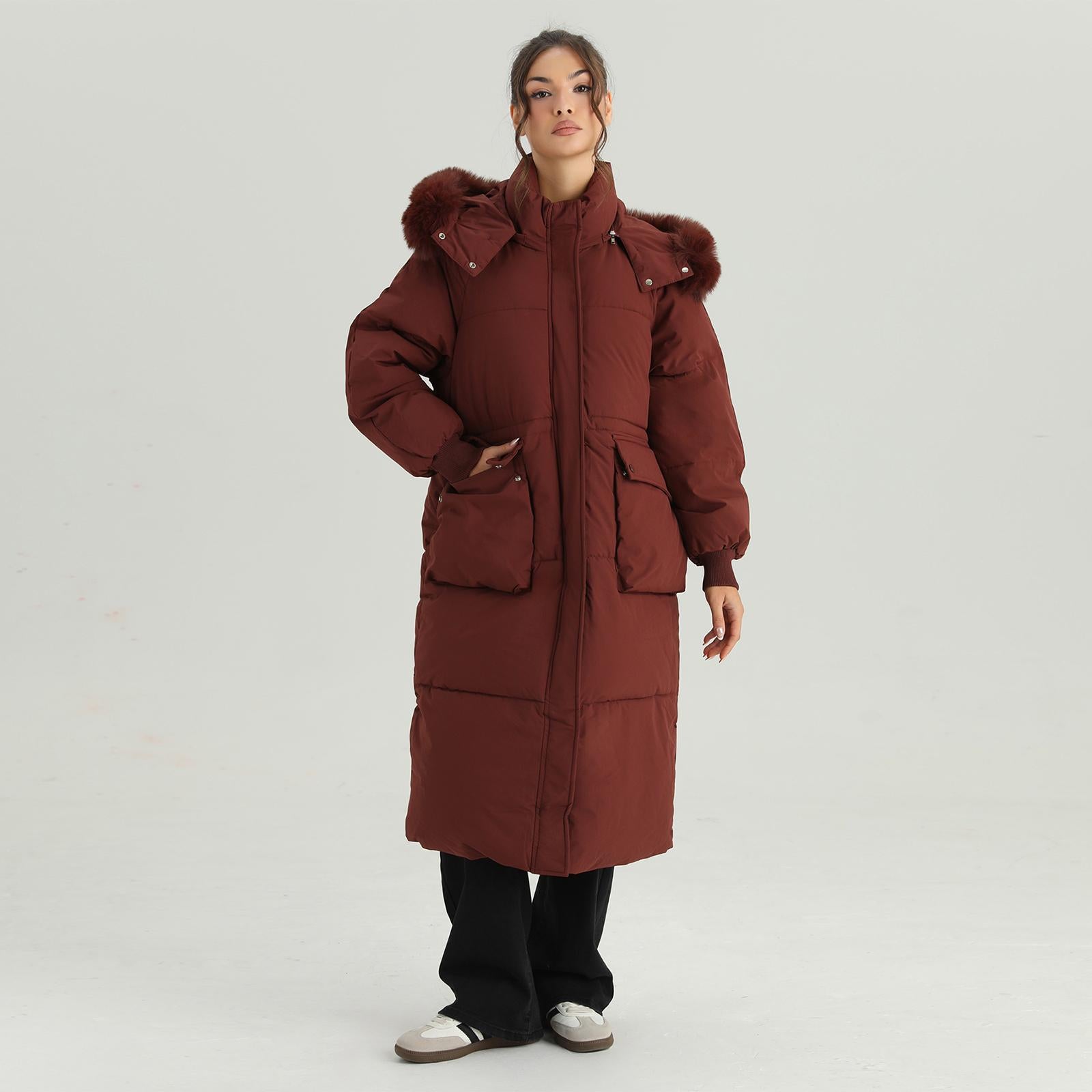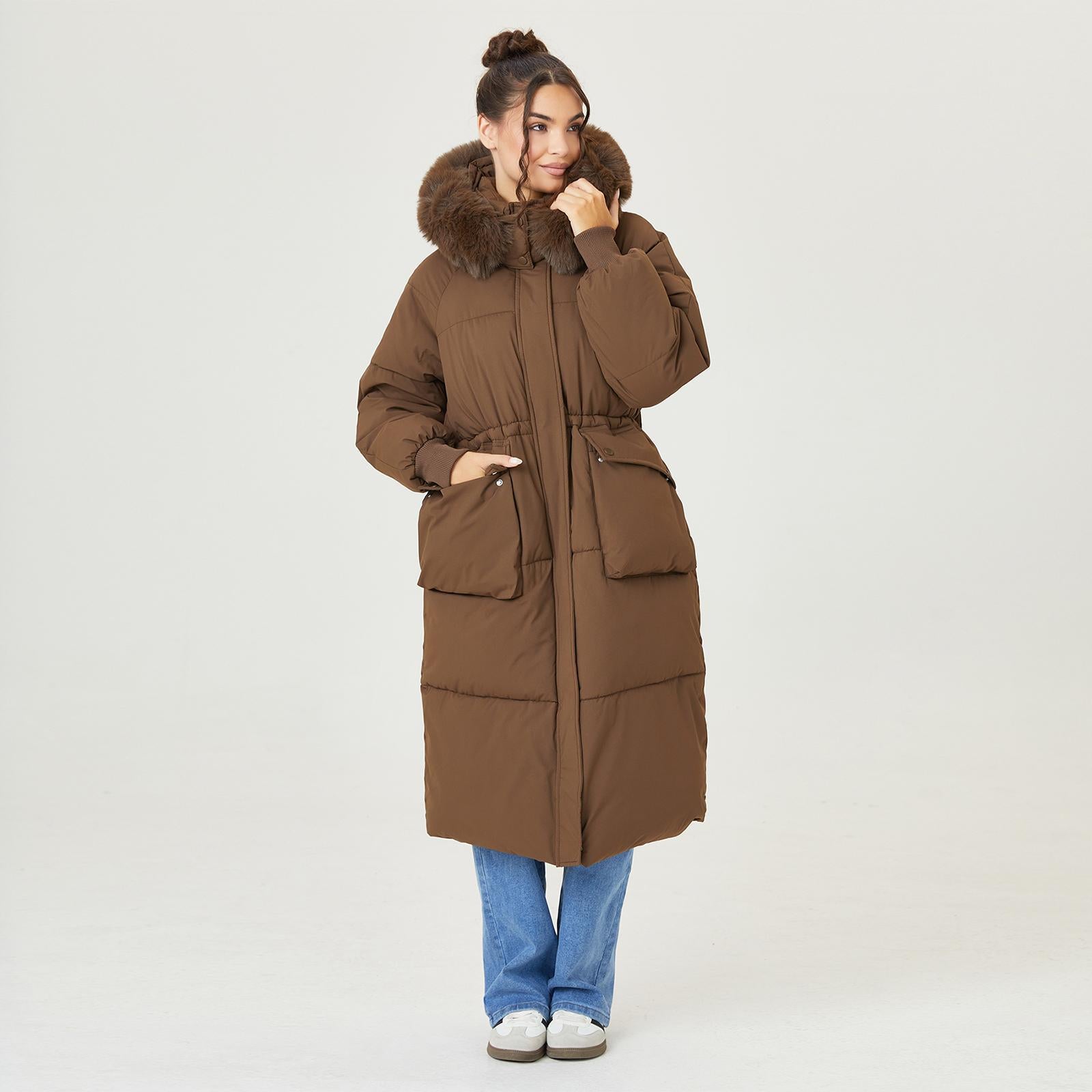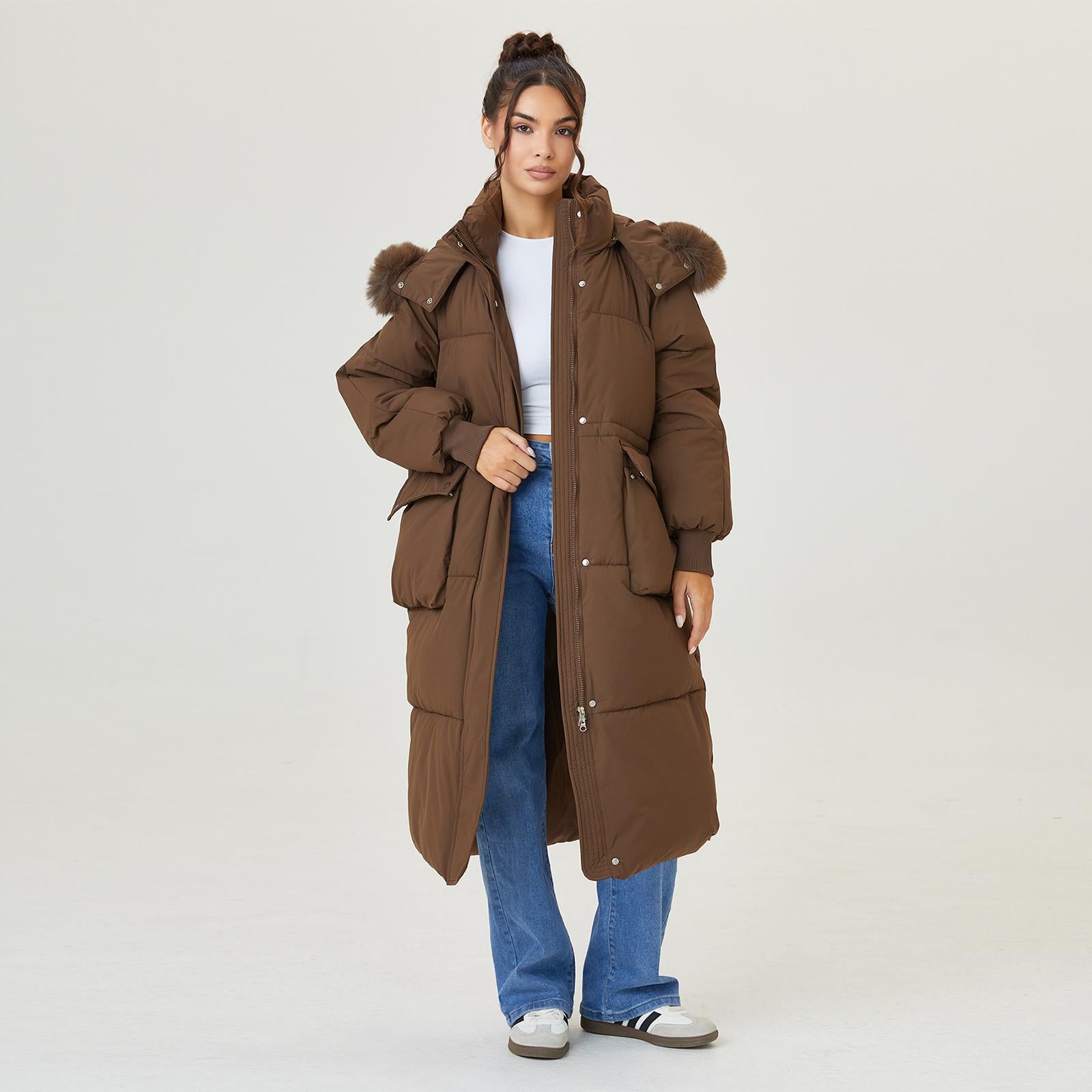 Details: Long sleeves, Attached fluffy hood, Flap pockets, Mid-length, Thermal fabric